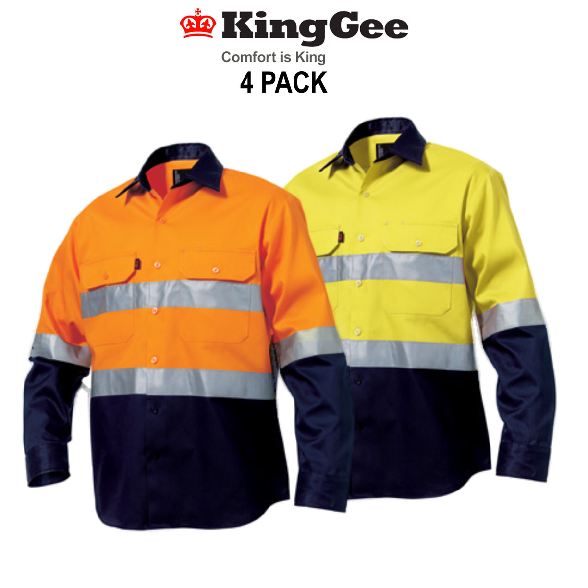 KingGee 4 Pack Hi-Vis Cotton Drill Shirt L/S Reflective Tape Work Safety K44532