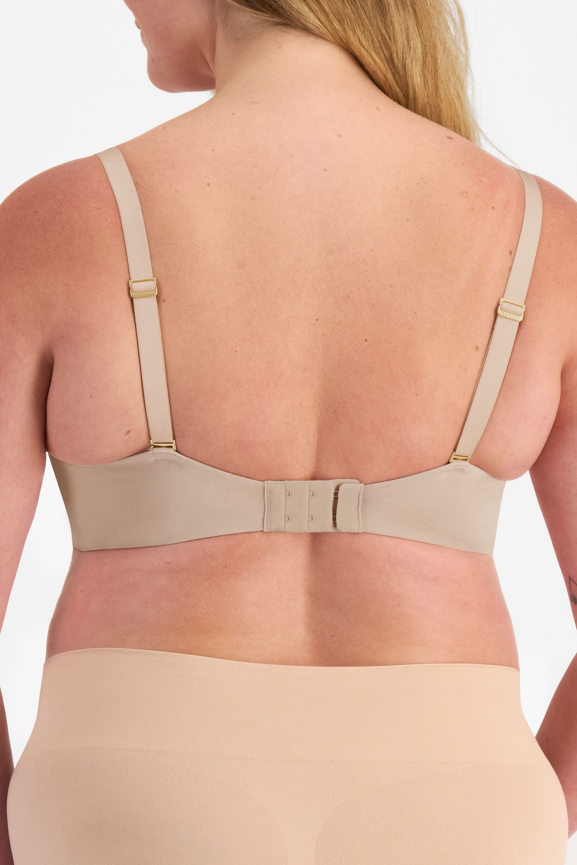 - Mesh front panels with subtle floral embroidery along the neckline, lighten the bra.